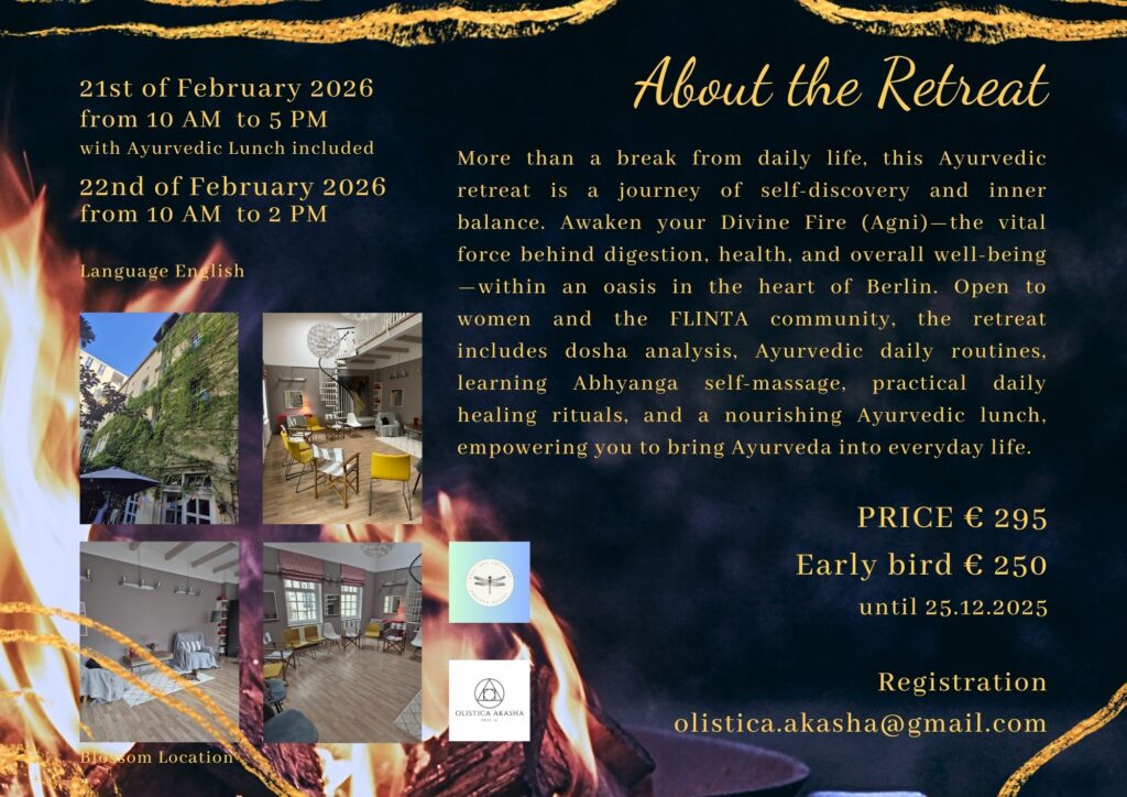 Divine Fire – Ayurvedic Retreat is an invitation into deep inner work — a conscious process of restoring your digestive fire, rebuilding vitality, and aligning with the natural rhythms of seasonal change. Rooted in the ancient wisdom of Ayurveda, this retreat supports you in understanding how shifts in season, lifestyle, and emotional patterns influence your Agni, and how to gently adapt your daily routines to remain grounded, nourished, and resilient.